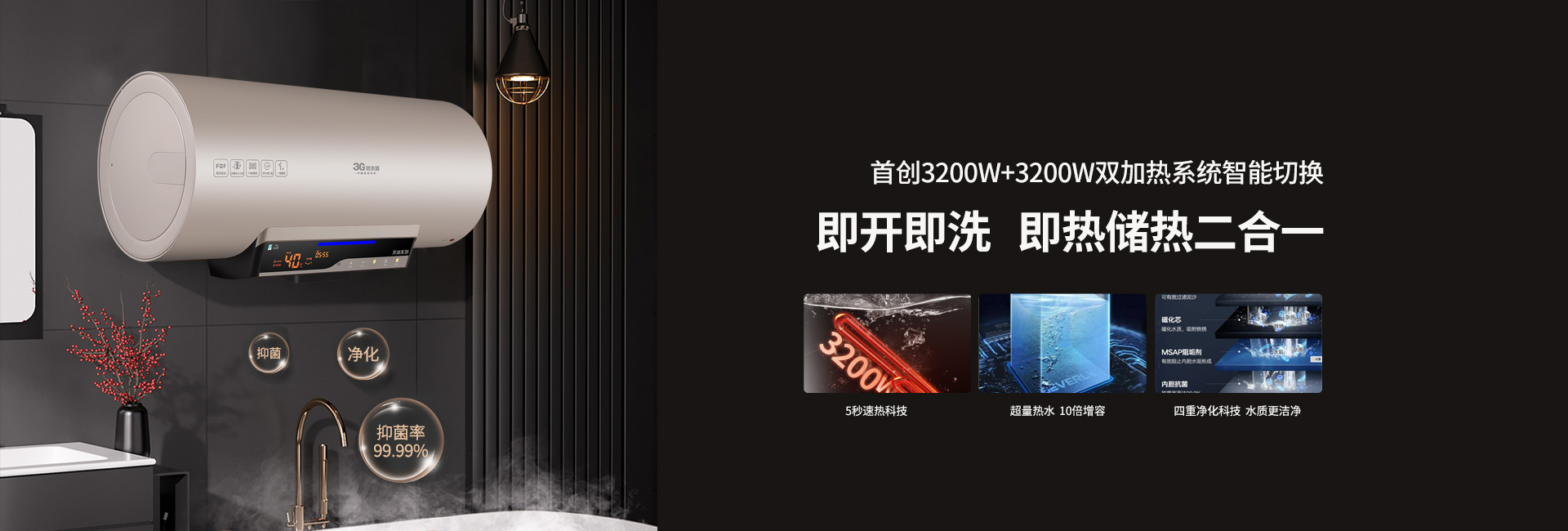 • 3200W速熱+3200W儲熱雙加熱系統:速熱儲熱2合1,快速升溫、3-5分鐘可洗。速熱浴缸機:10倍熱水、50L放500L熱水、裝1臺滿足全家洗浴需求。